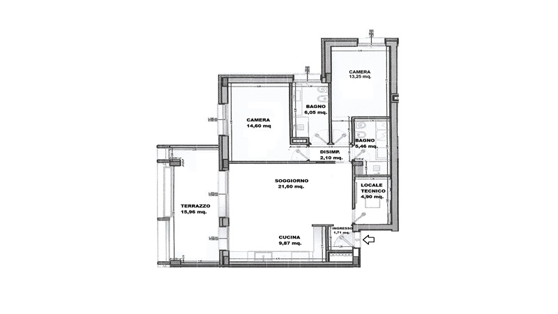 INGRESSO, SOGGIORNO CON CUCINA A VISTA (31 MQ.), TERRAZZO DI 16 MQ., DISIMPEGNO, 2 CAMERE DA LETTO,