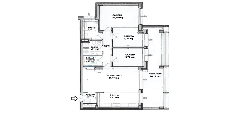TERRAZZO DI 24 MQ., DISIMPEGNO, 3 CAMERE DA LETTO, 2 BAGNI E LOCALE TECNICO IMPIANTI